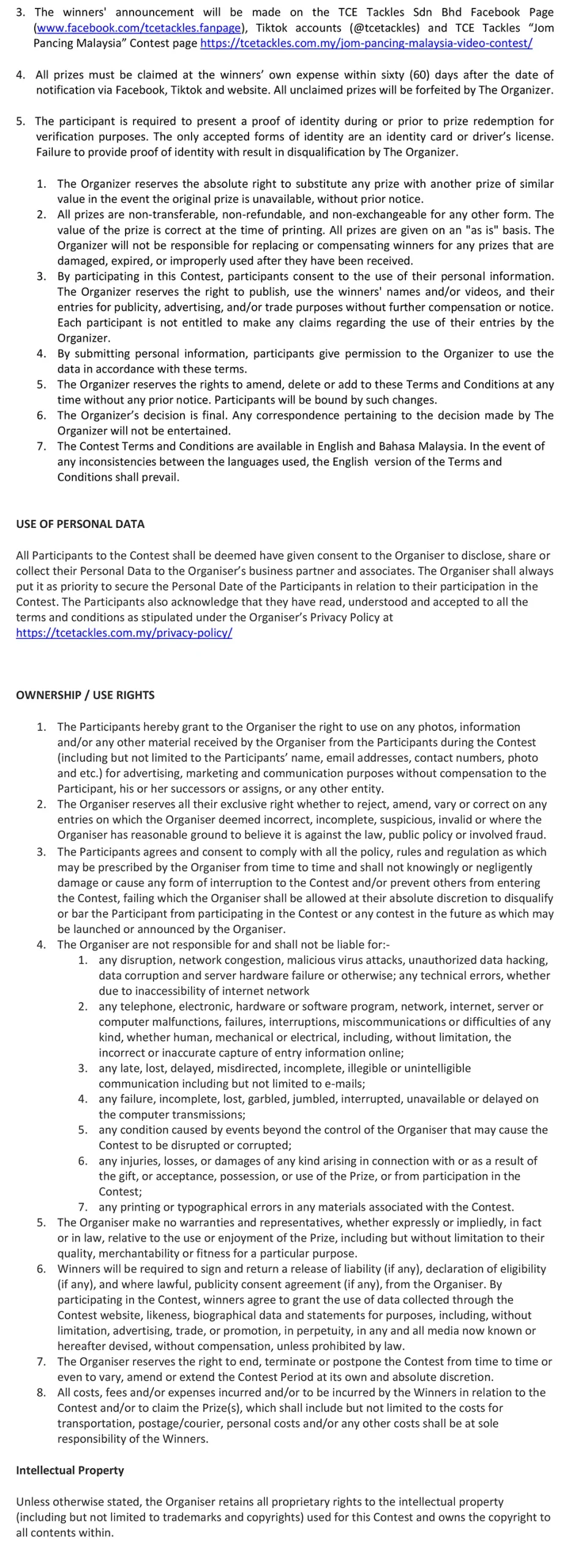 All Participants to the Contest shall be deemed have given consent to the Organiser to disclose, share or collect their Personal Data to the Organiser’s business partner and associates. The Organiser shall always put it as priority to secure the Personal Date of the Participants in relation to their participation in the Contest. The Participants also acknowledge that they have read, understood and accepted to all the terms and conditions as stipulated under the Organiser’s Privacy Policy at https://tcetackles.com.my/privacy-policy/