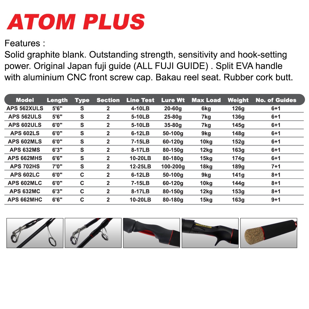 **NOTA: Terdapat maklumat yang salah mengenai percetakan rod dan kad gantung, yang mana Ajiking Atom Plus bukan sahaja Fuji Top Guide tetapi All Fuji Guide**